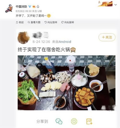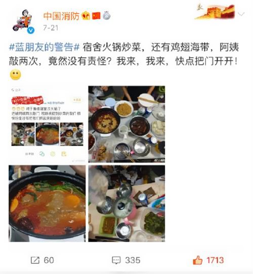 其實,這并非消防叔叔榜首次這么“關懷”同學們的宿舍消防安全了,前幾天, 就開端對宿舍吃火鍋宣布“正告”了: